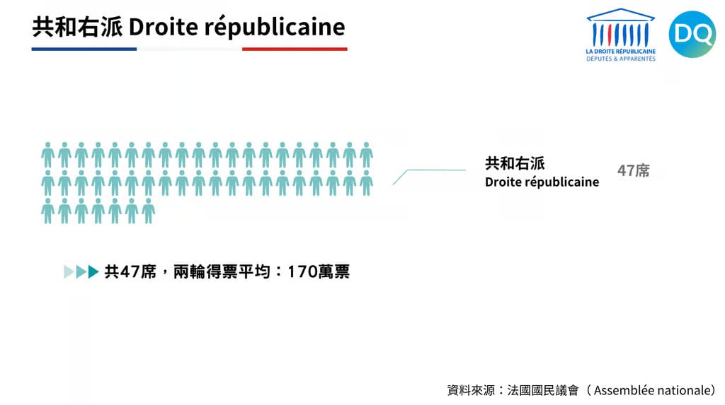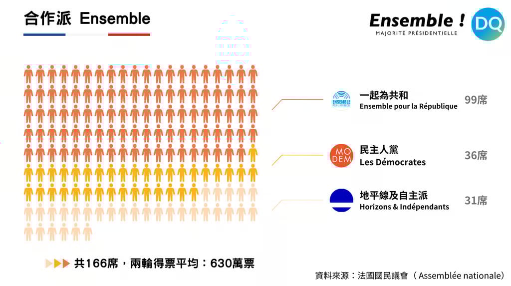 馬克宏的為共和國聯合黨(Ensemble pour la République)得99席,加上有同盟關係的民主黨人士(Les Démocrates,前Modem)36席、地平線自主派(Horizons & Indépendants)31席,共只有166 席。即使再加上其餘小黨,全部席次也只有242席;其中還包括戴高樂派的47席,該派在國會改名為民主右派黨(Droite républicaine)。