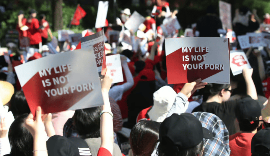 2018年7月,面對國內層出不窮的偷拍事件以及有關單位的消極態度,上萬南韓民眾集結在首爾街頭,高舉「我的人生不是你的A片」牌子抗議。