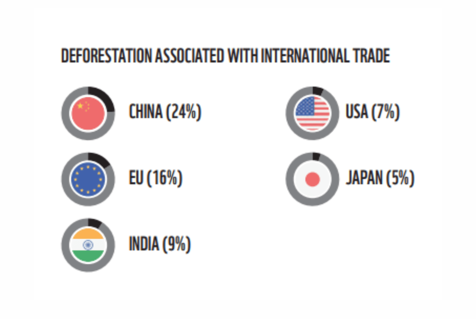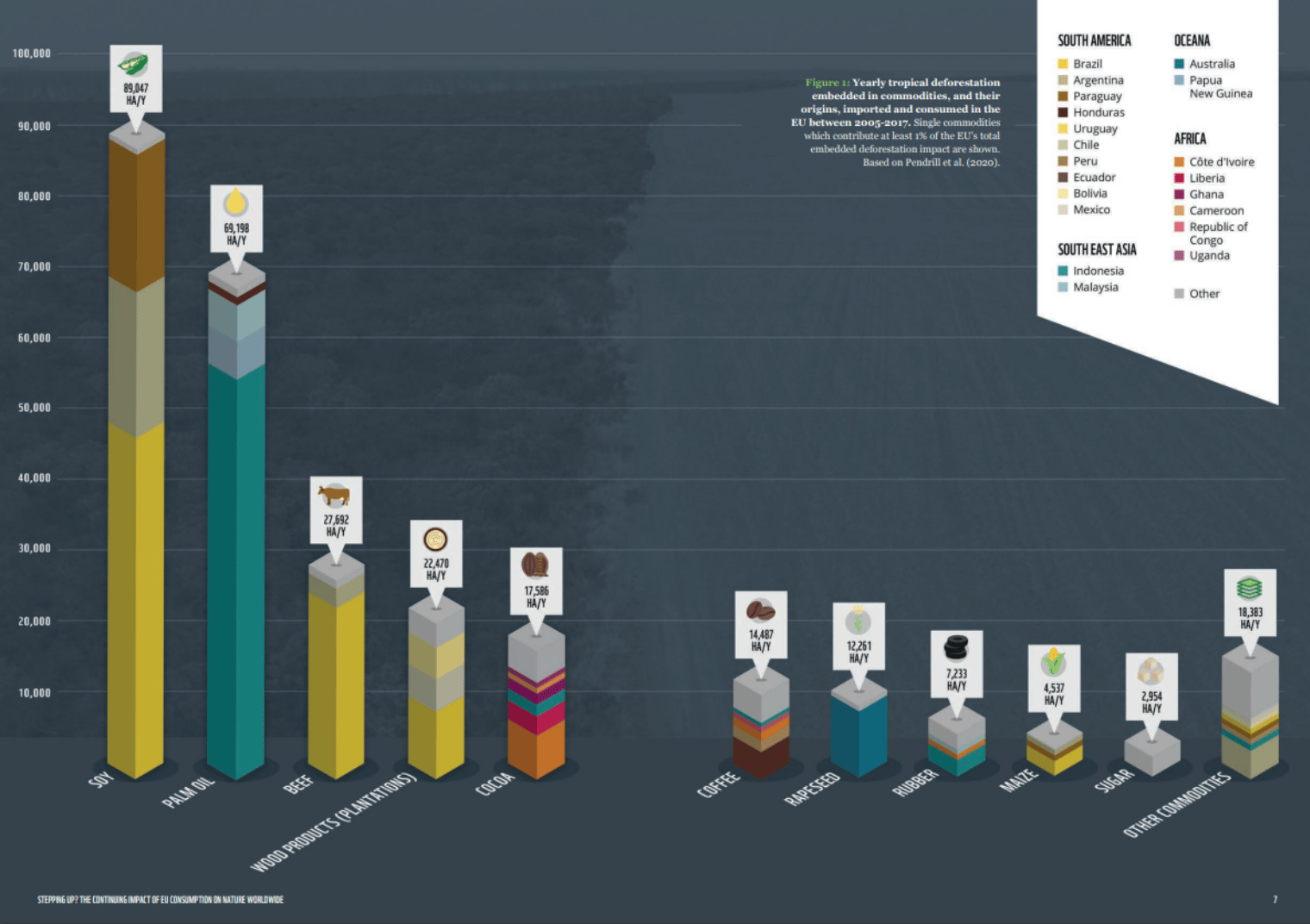 世界自然基金會(World Wide Fund for Nature,WWF)更發現,歐盟是毀林貢獻第二大的全球經濟體。如果歐盟完全禁絕其境內相關產品的毀林成份,預計將減少16%的毀林面積,以及每年3千2百萬噸的碳排放,相當於8.2座燃煤電廠一年的排放量。