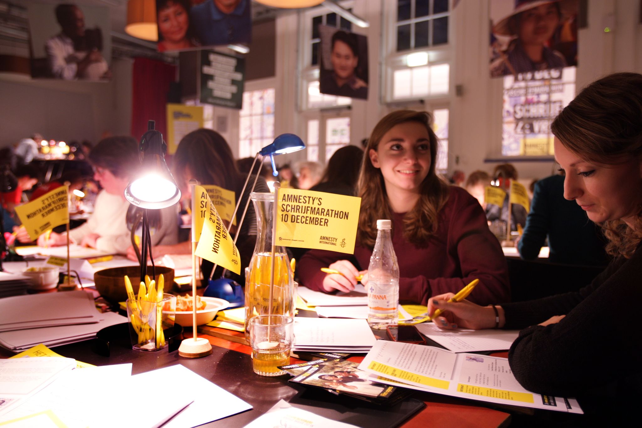 人們在荷蘭阿姆斯特丹的國際特赦組織總部參加「寫信馬拉松」活動。
