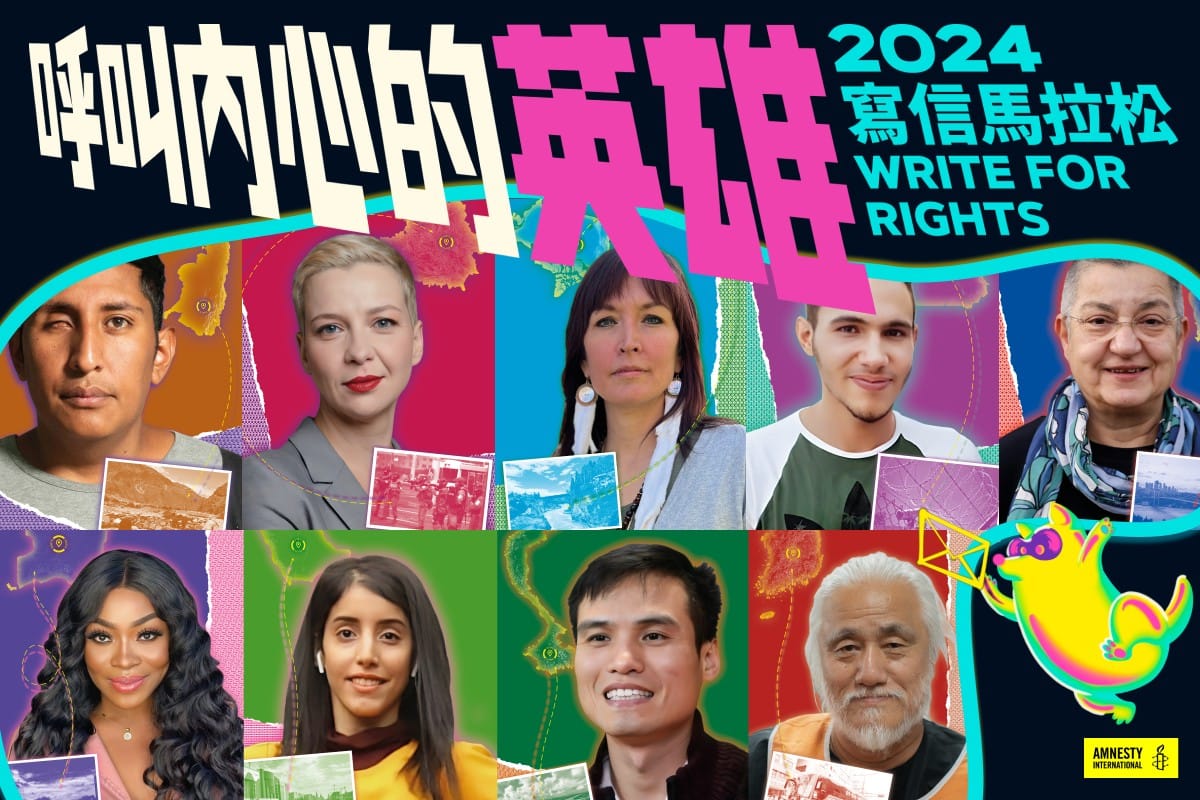 他們沒有可以拯救世界的超能力,他們唯一有的只是面對壓迫仍勇於發聲的堅持。2024年寫信馬拉松聲援的對象,還包括參加和平示威卻被警察射傷右眼的年輕父親喬爾 (Joel Paredes);參加競選活動,卻被扣上危害國家安全罪名的瑪麗亞柯列斯尼卡娃(Maryia Kalesnikava);反對加拿大天然氣管線工程,捍衛維舒維登族(Wetʼsuwetʼen)傳統領域的土地捍衛者們;被發現是人權行動者的弟弟,而遭受酷刑的歐克巴哈沙德(Oqba Hashad);20年來持續捍衛南韓身心障礙者人權的朴景錫;長年被土耳其政府騷擾的法醫專家瑟巴南(Şebnem);致力於維護越南永續發展的非營利組織創辦人鄧廷白(Dang Dinh Bach)等人。