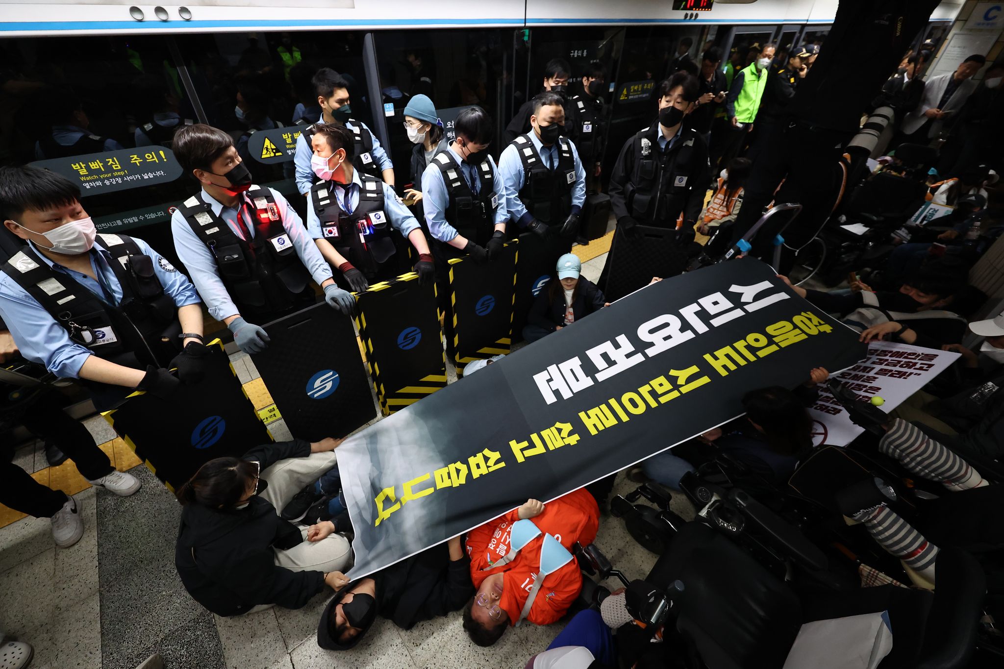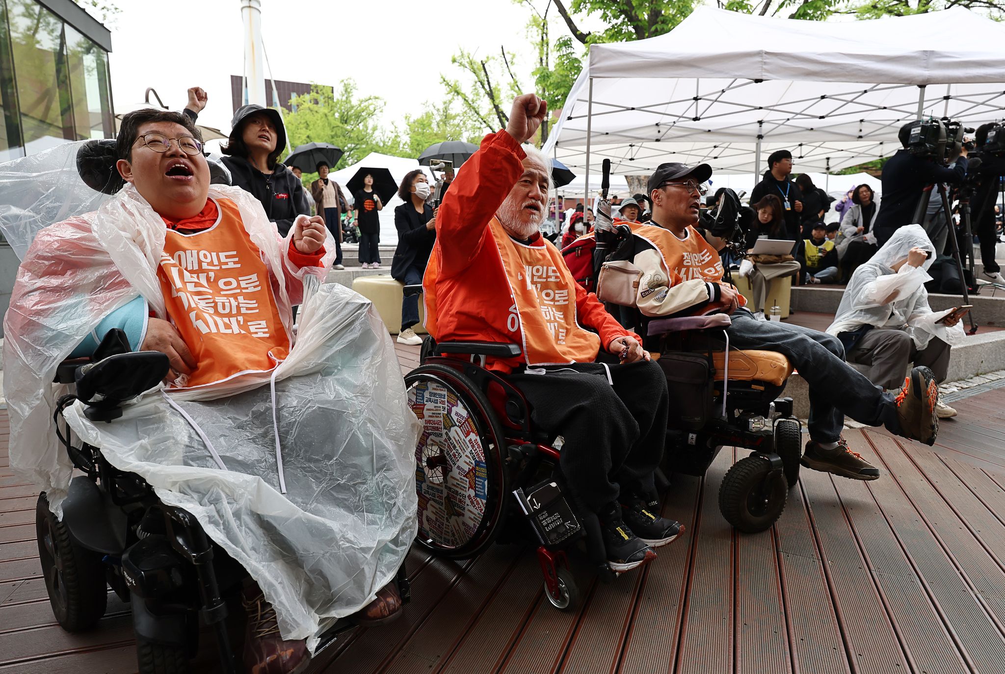 圖為 2024年4月20日,「團結反對歧視身心障礙」成員在首爾漢城大學站抗議。