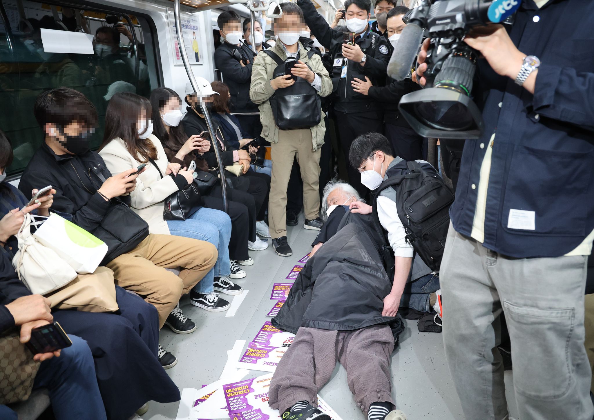 圖為2022年4月22日,朴景錫在地鐵上舉行抗議活動,要求政府增加無障礙設施的預算。