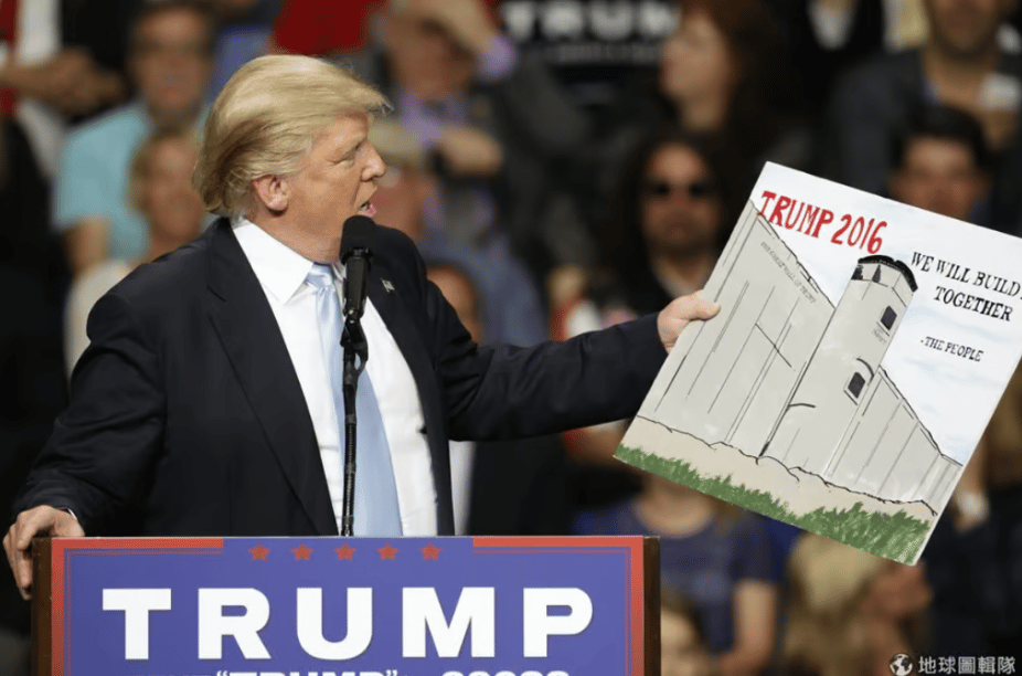 2016年,川普在一場造勢活動上,手拿一張畫有圍牆的圖片,他說要讓墨西哥自己出錢來建圍牆,擋下非法移民。