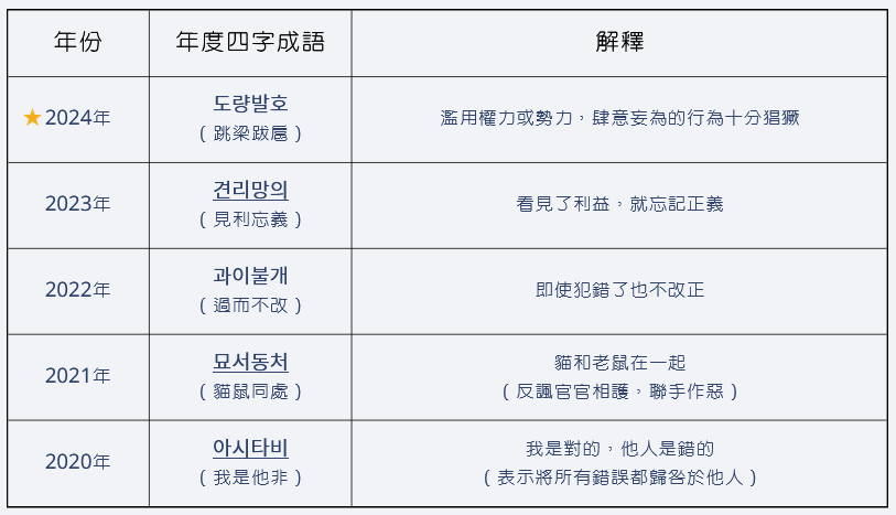 每年歲末,韓國大學教授們都會選出能夠代表當前社會現象的年度四字成語,2024年的首選為「跳梁跋扈」(도량발호),以「肆意妄為、濫用權力」的意涵,成為對當前韓國政經局勢的深刻訴諸。今年總計有1,086名教授參與此次投票,其中「跳梁跋扈」以41.4%(450票)高票當選。