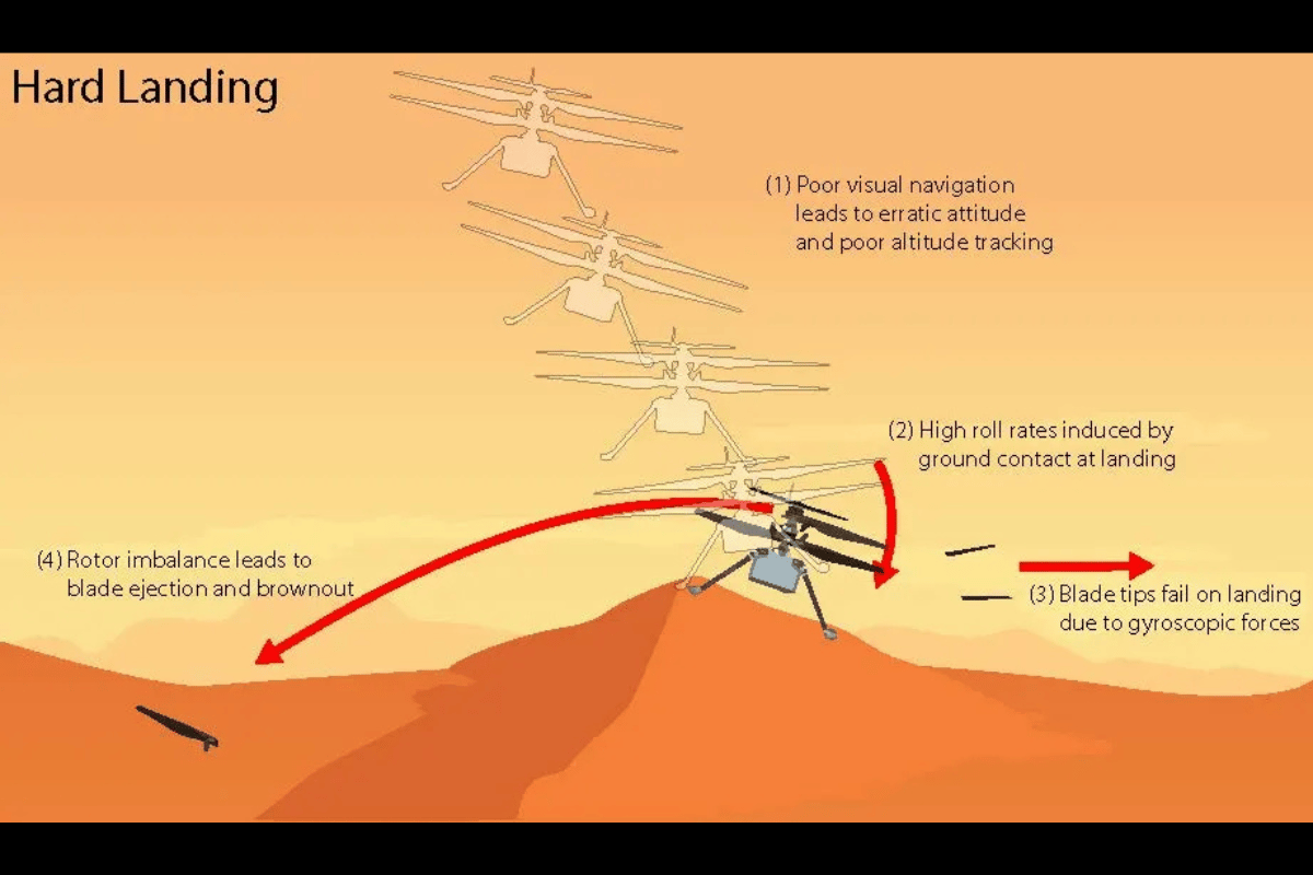 網友NASA/JPL-Caltech飛行數據顯示,在起飛約20秒後,導航系統無法找到足夠的地表特徵進行追蹤,錯誤導致著陸時的高水平速度。獨創號可能在沙地上硬著陸,導致機身傾斜翻滾,快速的姿態變化使高速旋轉的旋翼葉片超過負荷,導致四個葉片在距離葉尖約三分之一處的最薄弱點斷裂。