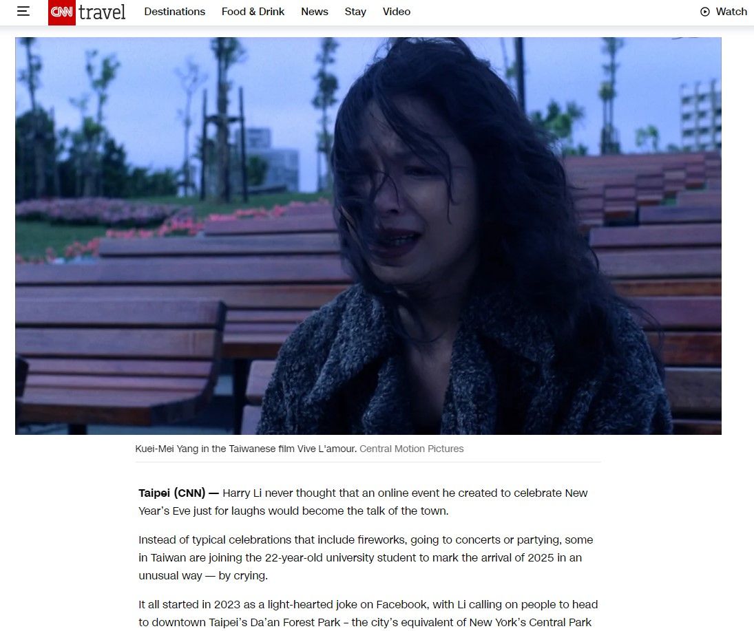這場「哭泣派對」的發起人是22歲的大學生李思翰,最初只是2023年Facebook上的一個玩笑。他號召大家在跨年夜到台北大安森林公園,一起哭半小時,致敬台灣導演蔡明亮執導的電影《愛情萬歲》中的經典場景。