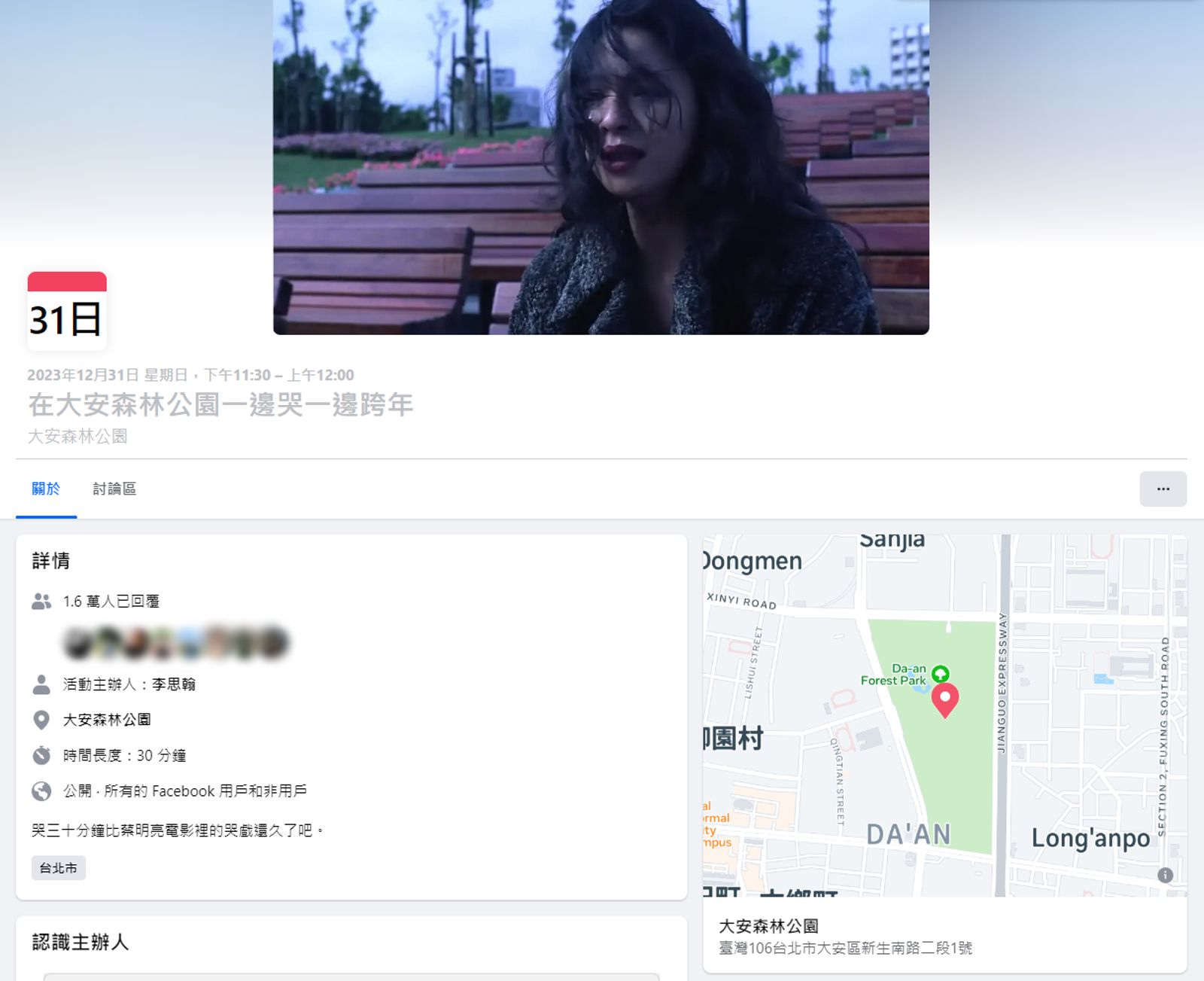 帶著半開玩笑的心情,李思翰在FB發起了「在大安森林公園一邊哭一邊跨年」的活動,活動照片使用了《愛情萬歲》中楊貴媚坐在公園內大哭的劇照。然而,李思翰沒想到這個「純屬玩笑」的活動居然吸引了1.6萬名網友表示有興趣,