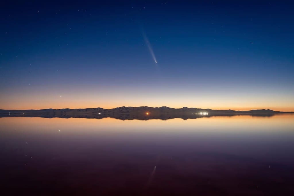 美國猶他州大鹽湖上空清晰可見的紫金山-阿特拉斯彗星。