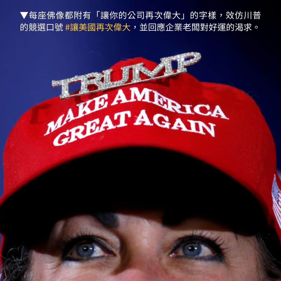 除了搞笑,洪金世也觀察到白手起家的創業者們渴求好運的願望,因此每座川普佛像都附有「讓你的公司再次偉大」的字樣。