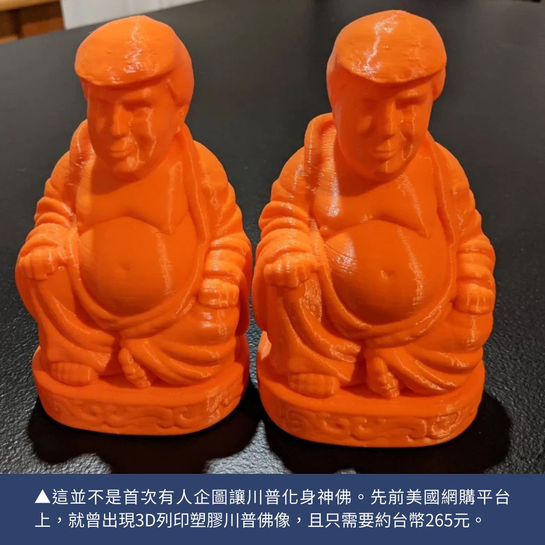 不過,這也不是首次有人企圖讓川普化身神佛。先前在美國網購平台Etsy上,同樣曾出現過一尊用3D列印機製成的塑膠川普佛像,而且開價更便宜,只需要約台幣265元,即可將川普佛像列入收藏。