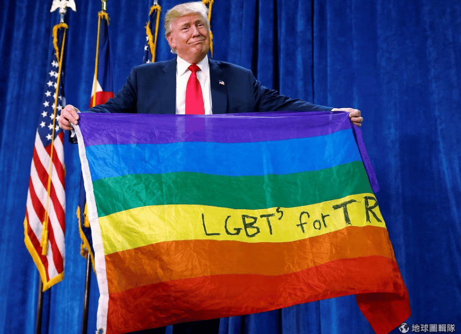 圖為 2016年10月,川普手拿彩虹旗,表達他對LGBT社群的支持。在競選期間,川普曾在言談間支持LGBT社群。