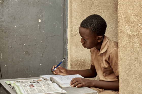 阿齊茲・基馬(Aziz Kima)放學回家後在門口就著斜陽寫功課。