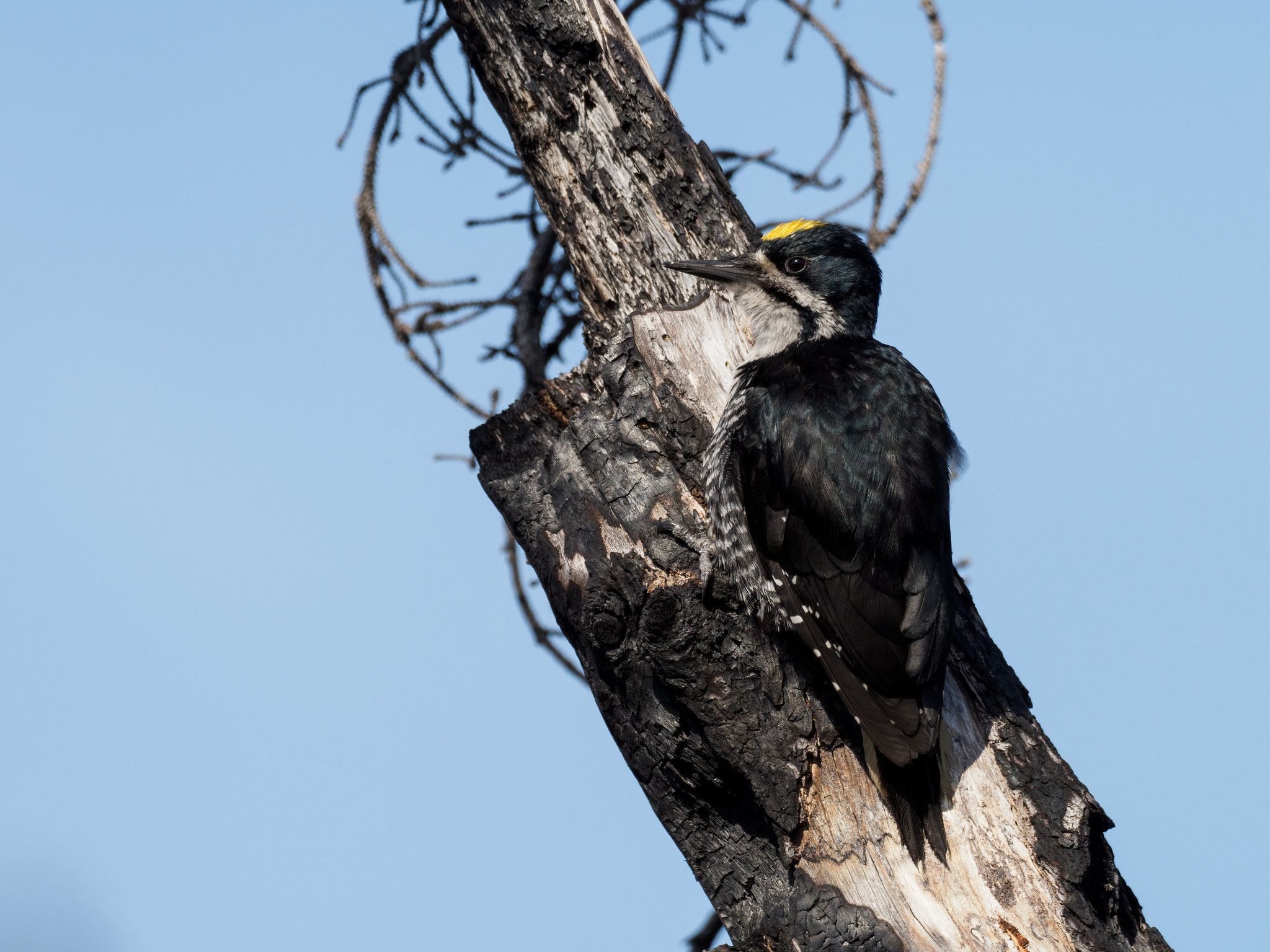 黑背啄木鳥(Black-backed Woodpeckers)同樣擅長在野火肆虐後的森林中生存。牠們會尋找森林火災的邊緣地帶,在遭嚴重燒毀的區域與未被燒毀的樹林交界處,找到中等大小的枯木鑽洞築巢。