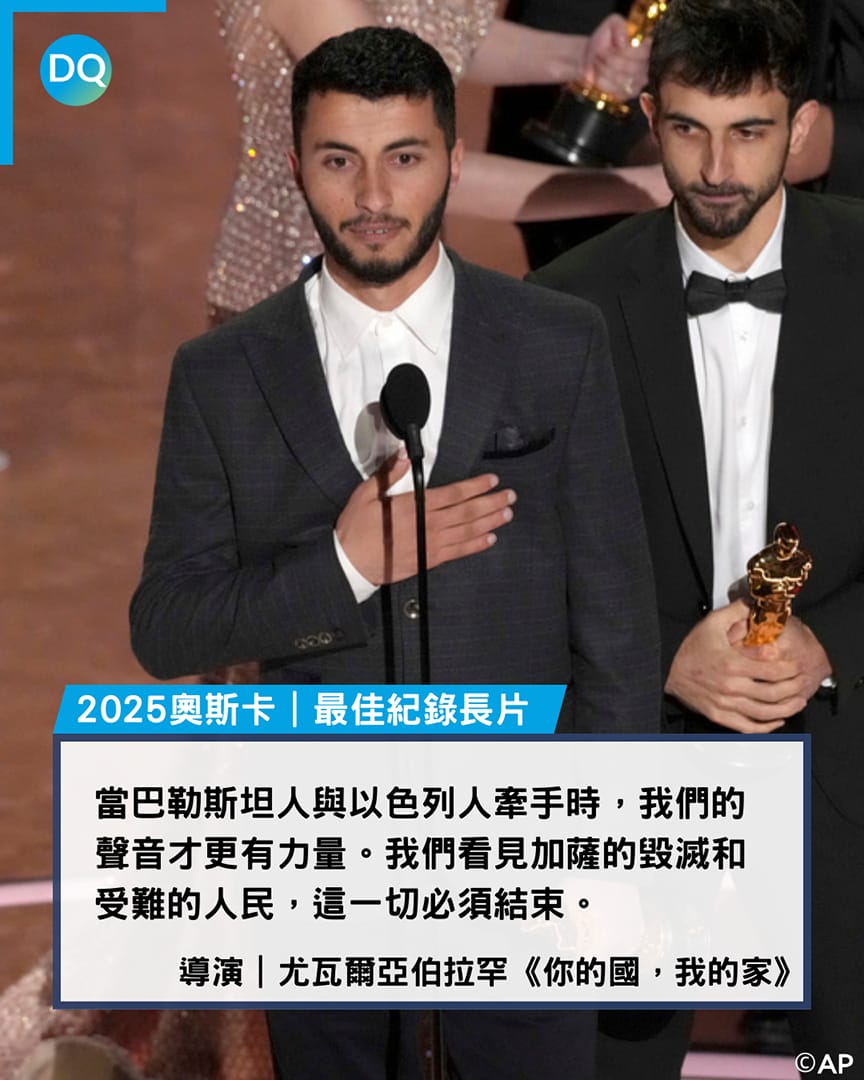 其中,由巴勒斯坦社運人士和以色列記者共同拍攝的《你的國,我的家》(No Other Land)則榮獲最佳紀錄片。導演之一的尤瓦爾亞伯拉罕(Yuval Abraham)的得獎感言提到:「當巴勒斯坦人與以色列人牽手時,我們的聲音才更有力量。我們看見加薩的毀滅和受難的人民,這一切必須結束。」語畢,全場響起熱烈掌聲。