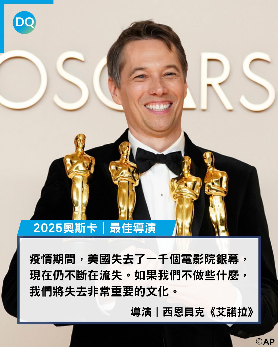 第97屆奧斯卡金像獎頒獎典禮,於美國時間2日晚間落幕,由西恩貝克(Sean Baker)執導的《艾諾拉》(Anora)拿下包括最佳影片、導演、女主角、原著劇本、剪輯等5項大獎,成為本屆最大贏家。