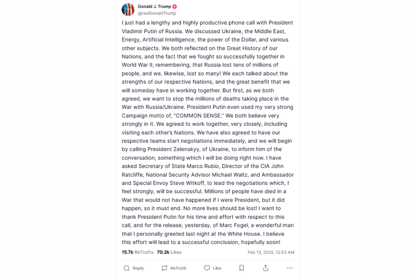 川普表示他與普丁進行了「長時間且富有成效的通話」,並稱這是結束烏俄戰爭的談判的開始。此次對話,為川普第二任總統期間,兩人首次確定的對話。