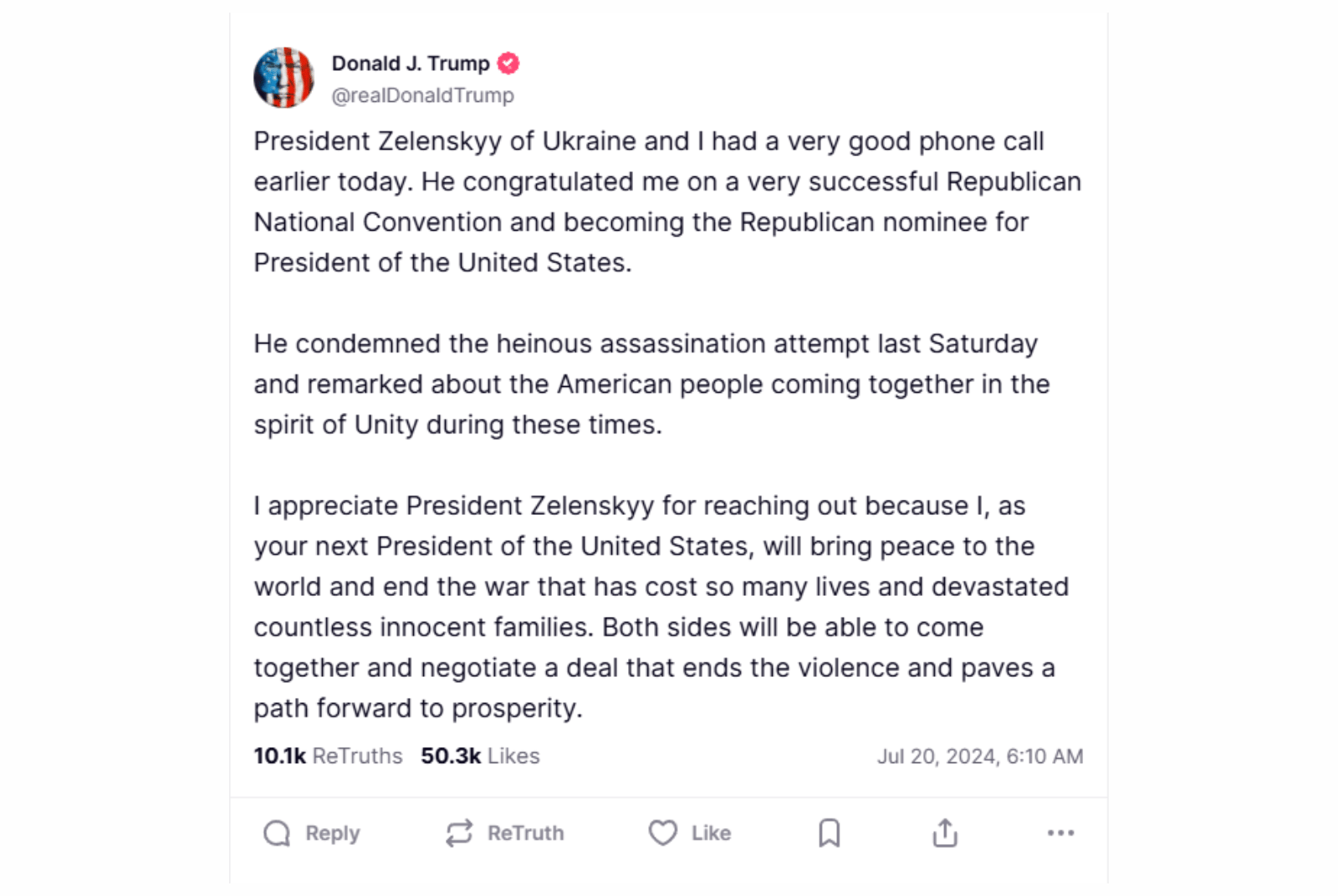 2024年7月,川普與澤倫斯基進行通話,這也是川普卸任後兩人首次通話。通話結束後,川普在社群上發文表示,兩人進行了一次「非常好的電話對話」,並表示他身為下一任美國總統,將為世界帶來和平,結束這場奪去眾多生命的戰爭,且烏美雙方將能「坐下來談判,達成能夠終結暴力的協議。」