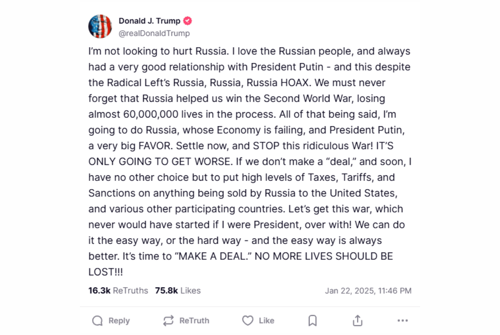 川普在社群上表示,自己並不想傷害俄羅斯,「我愛俄羅斯人民,並且一直與普丁總統保持著很好的關係。」他提到,自己希望為俄羅斯提供幫助,立刻停止這場荒謬的戰爭,並希望各方能盡快達成協議,以簡單的方法結束戰爭。