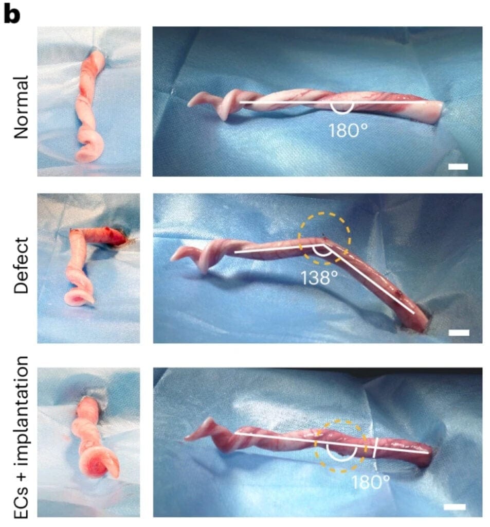 圖片由上至下,分別為正常的豬陰莖;海綿體受損的豬陰莖;以及移植兩週後,團隊使用3D列印植入物與內皮細胞融合修復的豬陰莖。