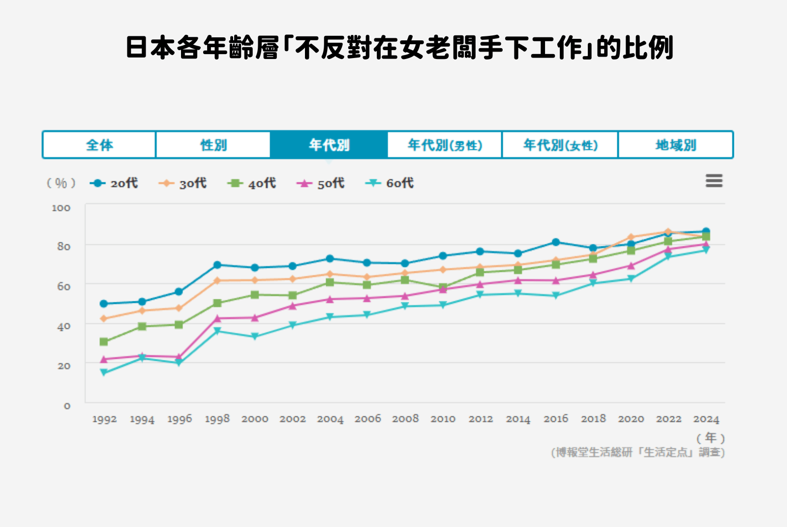 博報堂生活綜合研究所對於各年齡層「不反對在女老闆手下工作」的態度調查,可以發現隨著時間推進,各年齡層對於女老闆的接受程度逐漸升高、差距縮小。