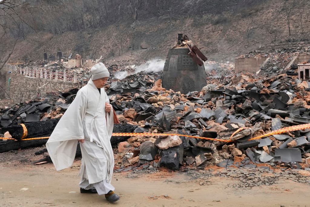 美聯社 / 達志影像null面對野火威脅,位於慶尚北道的世界遺產鳳停寺(봉정사)不得不做出艱難決定:斬除圍繞寺廟逾200年的松樹。住持表示,儘管這些古樹已守護寺廟二百餘年,但為防止火災蔓延,別無選擇。他們已嘗試各種防災方法,最終仍決定清除周圍30公尺範圍內的樹木,以保護這座珍貴的文化遺產。