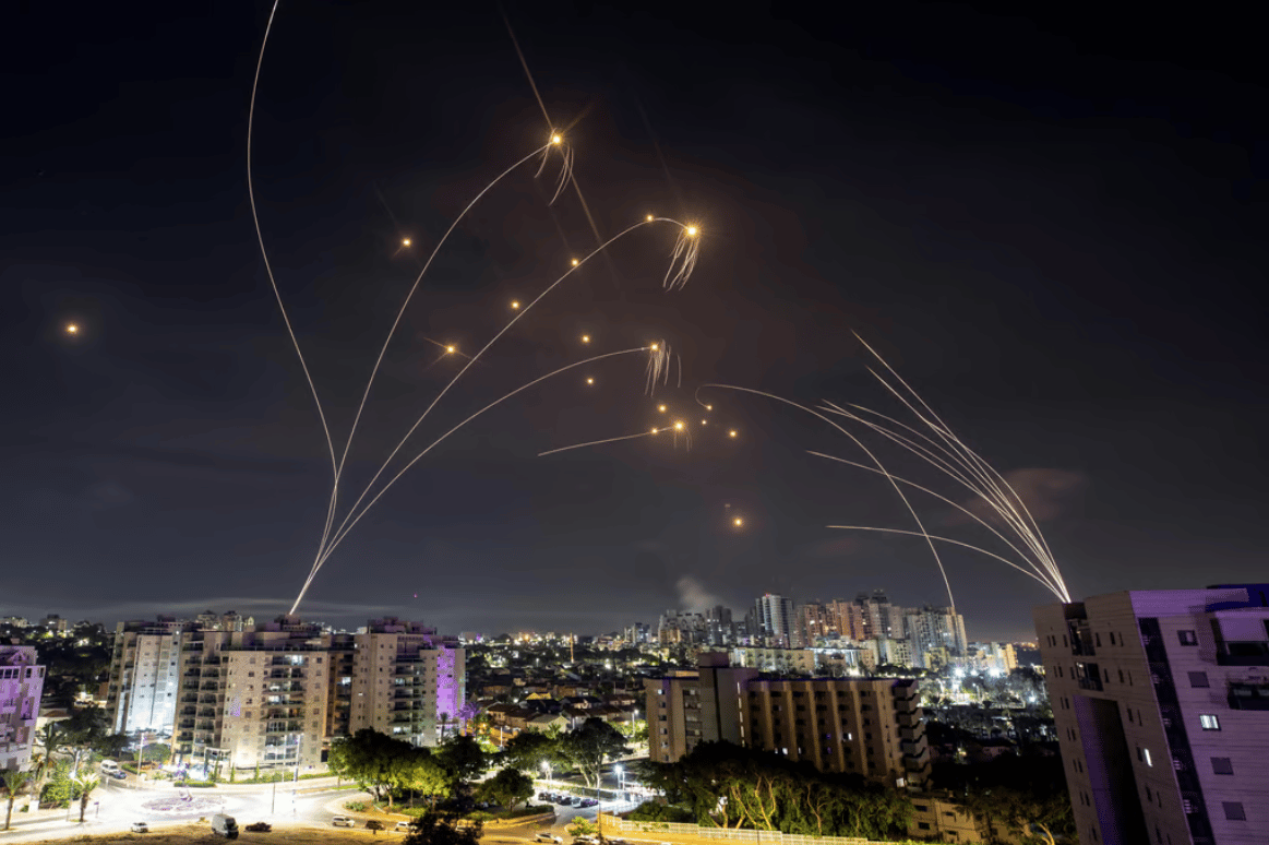 10月8日,以色列與巴勒斯坦持續互相轟炸、對戰,圖中為以色列的彈藥攔截系統—以色列的鐵穹(Iron Dome)(左)迎戰哈瑪斯的火箭攻擊(右)。