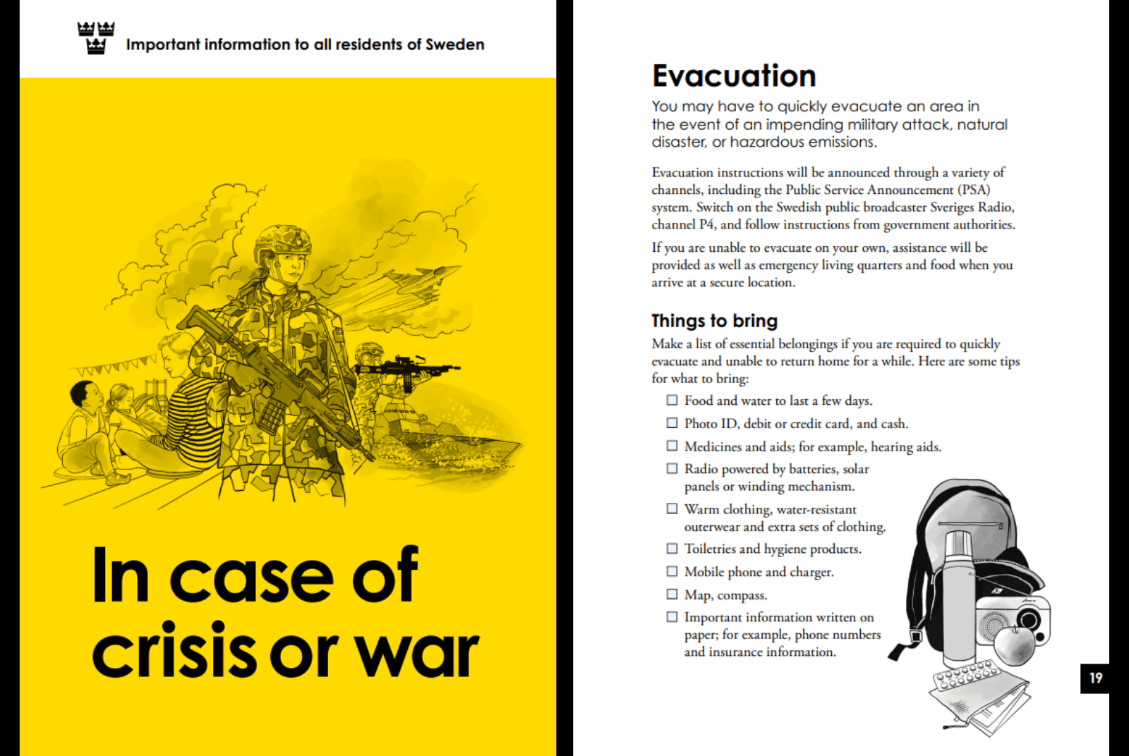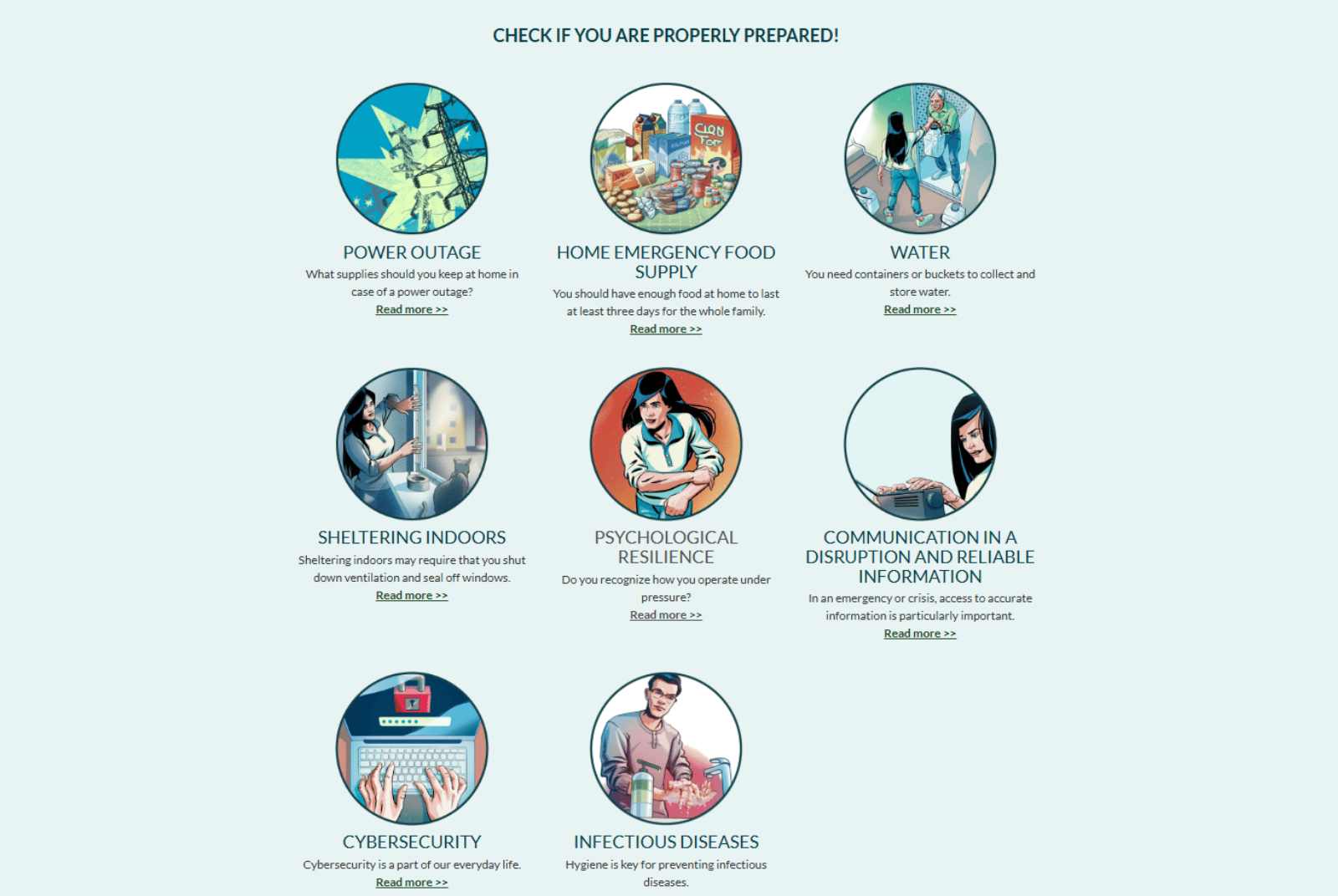 芬蘭推出了一份名為《應對突發事件與危機》(Preparing for incidents and crises)的線上指南,向民眾提供斷水、野火、網路崩潰、軍事衝突等情境下的應對資訊與建議。