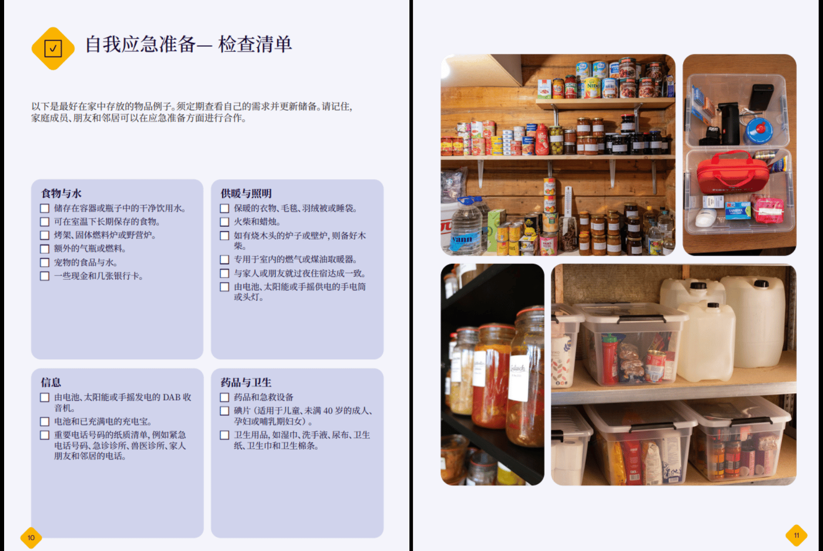 鼓勵公眾採取實際措施,例如在緊急情況下至少儲備 72 小時的基本物資。