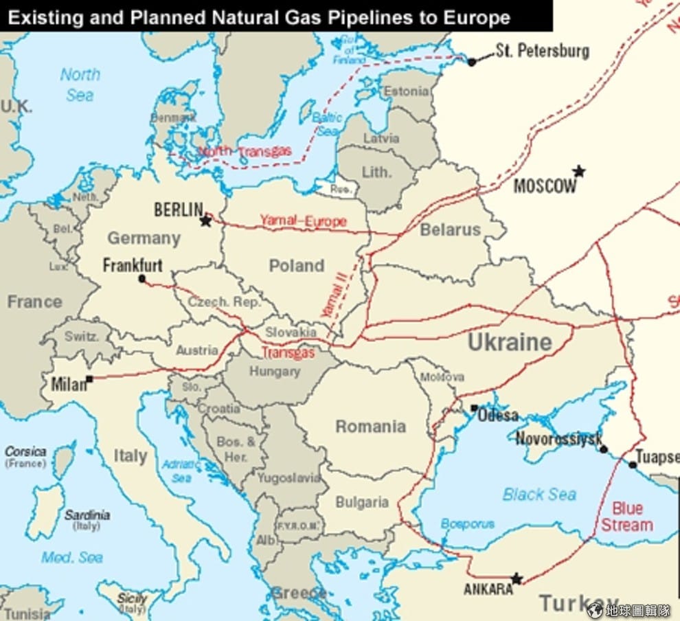 美國提供的天然氣管線分布圖中,可以見到歐洲地區有許多國家仰賴來自俄國的天然氣,圖片中的紅線代表著天然氣管線。photo credit: wikicommons