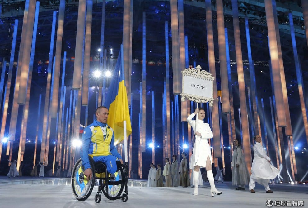 路透社日前(3/7)2014冬季殘奧開幕儀式上,代表烏克蘭出席的選手Mykhaylo Tkachenko一人舉旗進場。