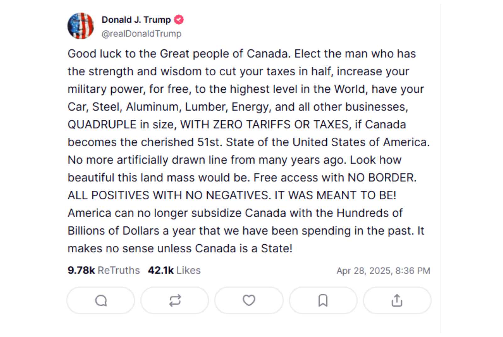 根據外媒報導,選舉期間川普仍持續提出併吞加拿大的想法。上週,加拿大國家廣播公司(Radio-Canada)的一則報導披露,川普曾於3月28日與卡尼通話,提到讓加拿大成為「美國第51州」;而在《TIME》的專訪中,川普也提到這個想法「真的不是在開玩笑」。