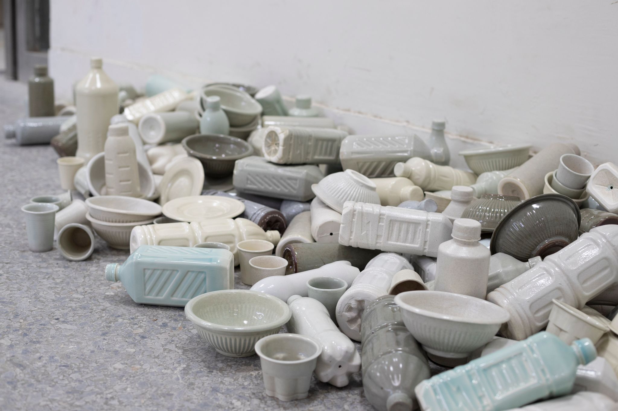 而這次展覽中年紀最輕,是1998年出生的藝術家賴科維,2025年輔獲得台南新藝獎以及高雄獎評審團獎。他的作品經常使用模具進行陶瓷的大量生產,再選用塑膠外型的器物翻製,試圖扭轉塑膠器物外型價值的想像,以年輕世代嘲弄、遊戲的方式,體現趣味與嚴肅並陳的幽默。