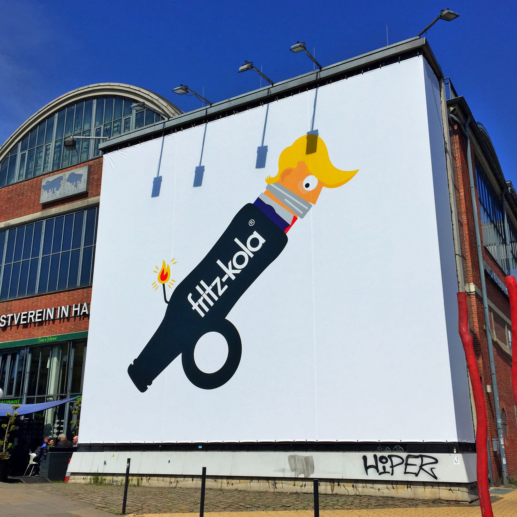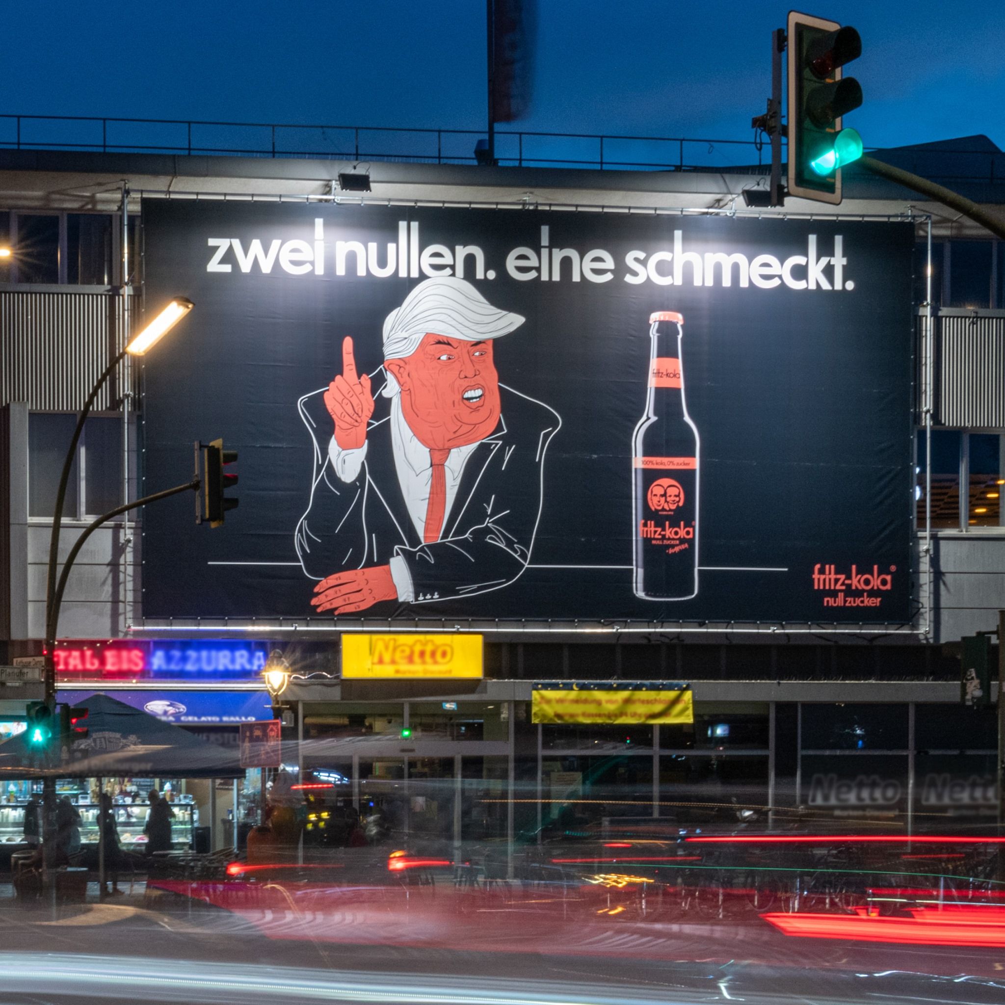 德國可樂品牌Fritz-Kolay在川普首次執政期間,曾經推出諷刺川普的廣告看板。