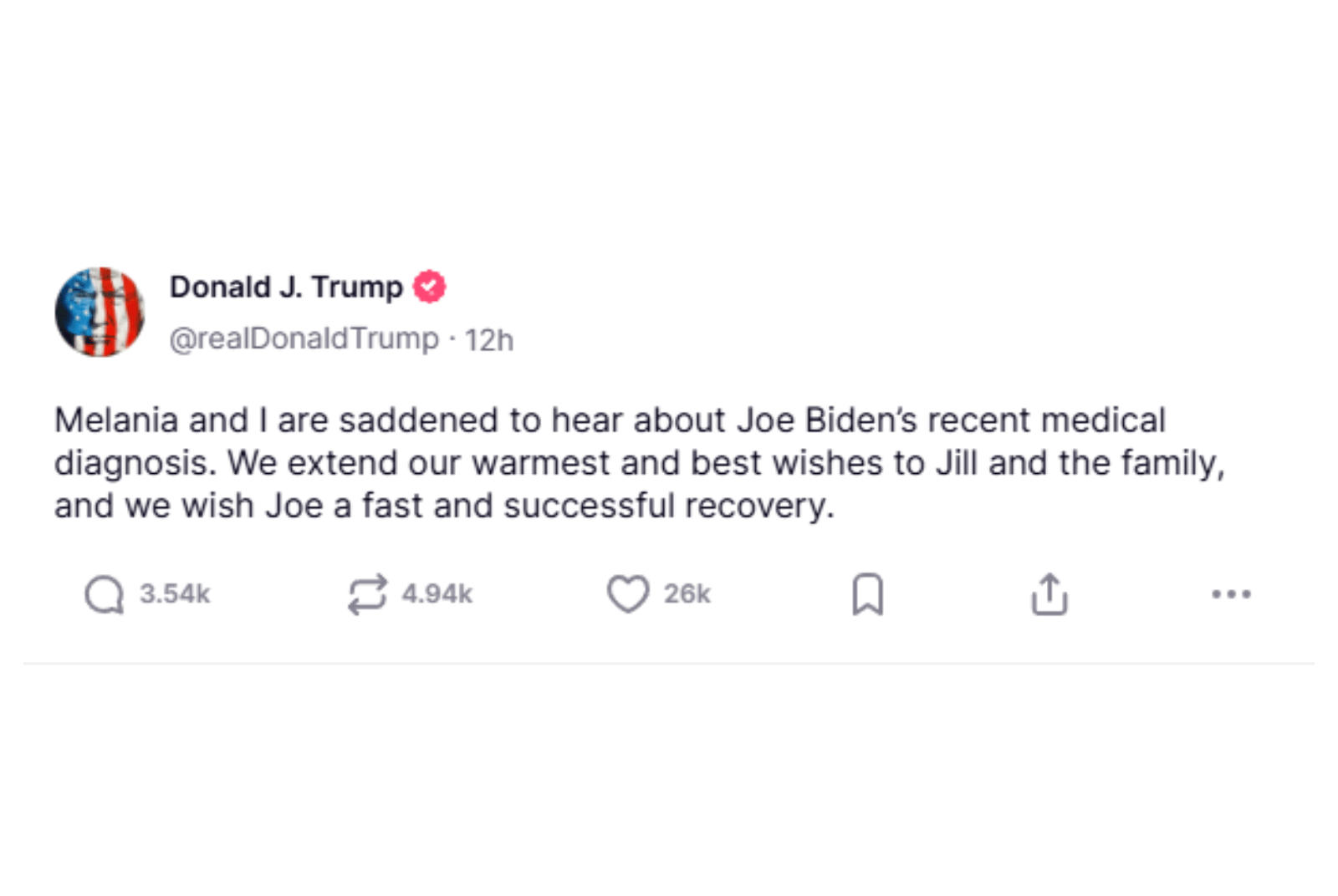 罹癌的消息一釋出,各黨派、各國的政壇人物紛紛向拜登表達關心。去年曾於選戰中與拜登激烈交鋒的川普(Donald Trump)在Truth Social寫道:「梅蘭妮亞(Melania Trump)和我聽到喬.拜登最近的醫療診斷結果後感到非常難過。我們向吉兒(Jill Tracy Biden)和其家人致以最熱烈、最美好的祝福,祝福喬早日康復。」