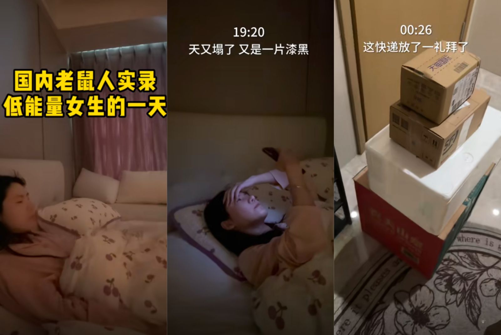 「沒事幹再休息一會兒,睏了回床上躺會,躺著躺著不知道啥時候睡著了。」今年2月,一位抖音網紅分享了她的慵懶生活,幾乎整天窩在床上滑手機,晚上7點才吃上第一餐的一天、半夜才拆放了一週的包裹,並在短影音中自嘲是「國內老鼠人實錄」。這一系列的短影音,成為中國「老鼠人」風潮的起點。