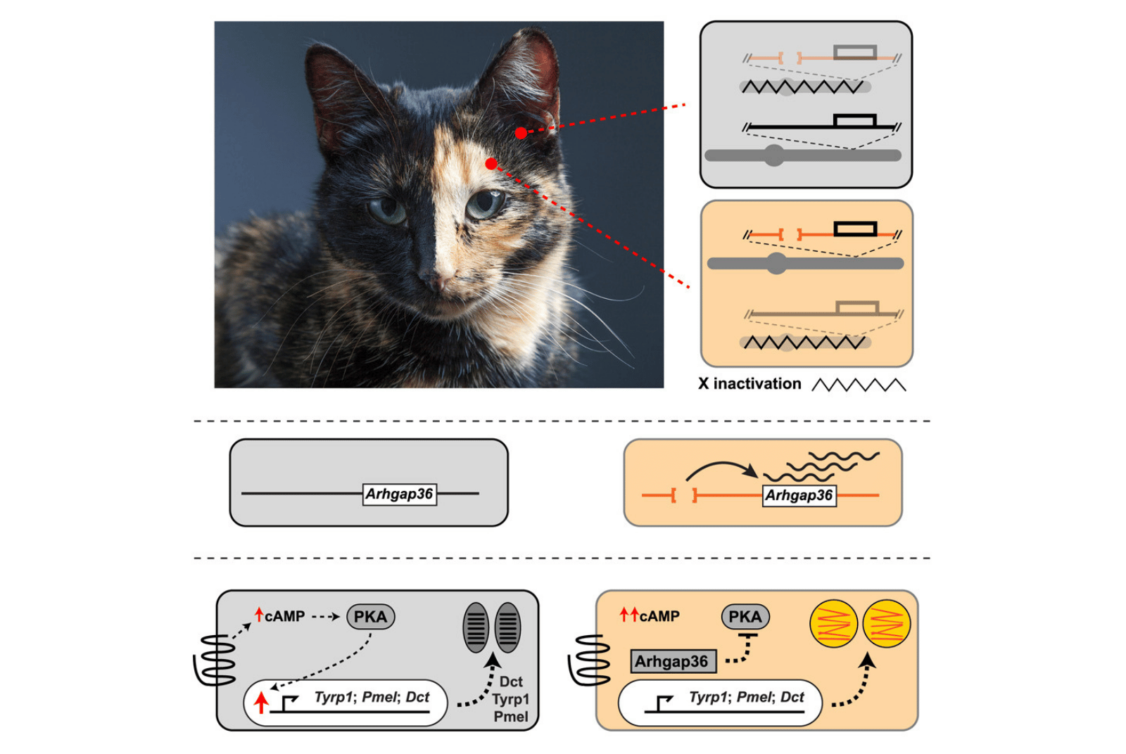 那麼,這個ARHGAP36發生了什麼事,又是為什麼可以產生橘色貓毛呢?根據研究團隊分析,在擁有橘色毛髮的貓咪身上的ARHGAP36這段基因中,皆缺失了一小段基因序列。而缺少這段序列後,就好像是打開了一個開關,讓ARHGAP36的表現更加活躍,提高蛋白質產量。