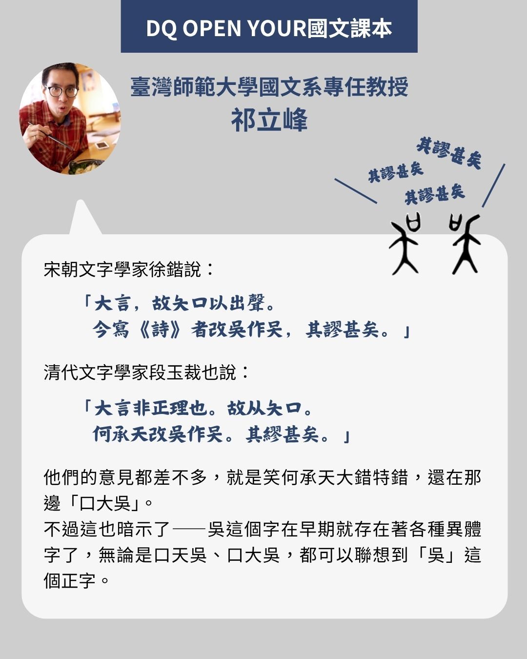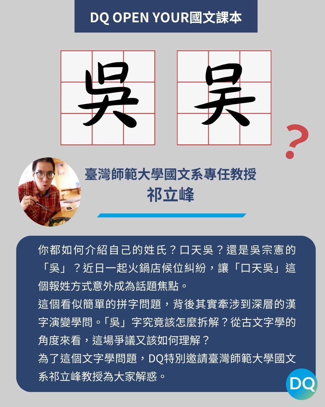 然而,這個看似簡單的姓氏拼讀問題,背後其實牽涉到漢字演變的學問。「吳」字到底該怎麼拆解?「口天吳」的說法究竟對不對?為了深入探討這個文字學問題,DQ特別邀請臺灣師範大學國文系祁立峰教授為讀者詳細解析。