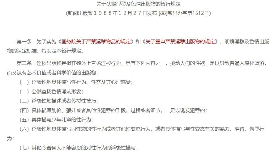 1989年,中共中共中央宣傳部成立「掃黃打非」機構,全名是「掃除黃色出版物、打擊非法出版活動」,負責稽查非法色情出版物。