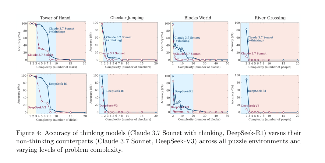 這篇名為《思考的幻象》(The Illusion of Thinking)的研究指出,當所謂的大型推理模型(Large Reasoning Models, LRMs)被要求解決高複雜度問題時,其解題能力會迅速瓦解,準確率最終跌至零。更令人驚訝的是,研究團隊在某些情況下即使直接提供能正確解題的演算公式,模型仍未能得出正確答案。