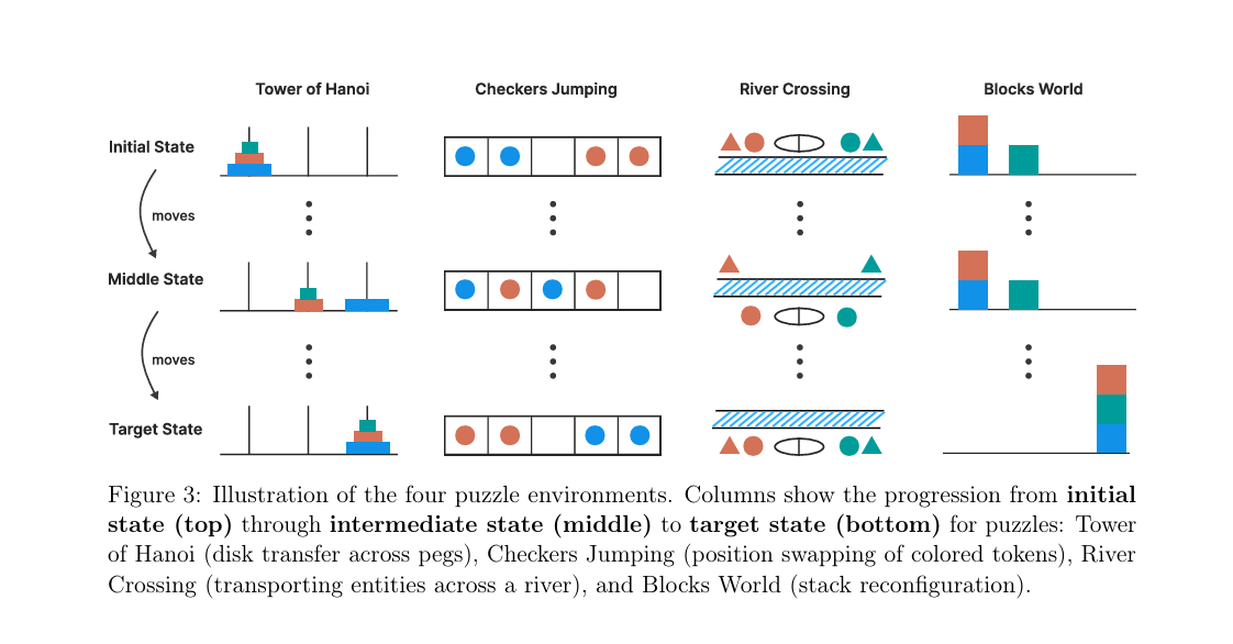 研究團隊使用可控的邏輯拼圖環境(controllable puzzle environments)來測試模型推理極限:透過一系列邏輯推理拼圖(如河川過渡、漢諾塔塔),並將問題複雜度分級控制(低、中、高)。每個環境維持相同邏輯結構,但改變組合(如增加塔層、高度),精確操控「複合性」變數。設計的測試包括經典的邏輯謎題,如「渡河問題」與「河內塔問題」,這些需要模型進行多步推理與規劃。研究人員特別設計,讓題目區分成「簡單、中等、困難」三種難度。