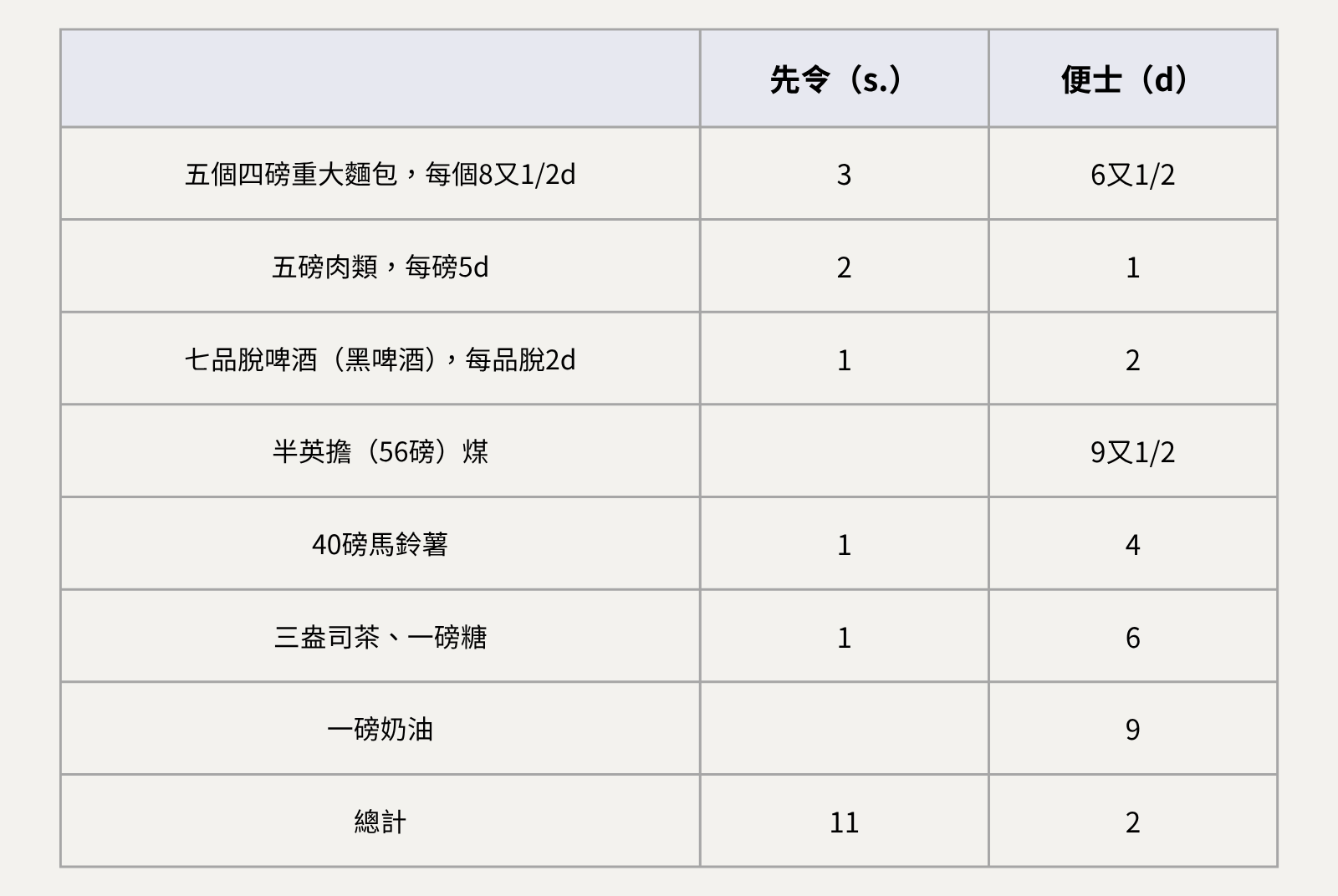 網友 Fondo Antiguo de la Biblioteca de la Universidad de Sevilla在倫敦,許多勞工的生活同樣困苦。以狄更斯《聖誕頌歌》中的克瑞奇(Bob Cratchit)為例——他是史古基(Scrooge)手下薪資微薄的員工,每週收入僅15先令,卻還得養活一家人,對飲食的選擇自然非常有限。若他的妻子是個精明能幹的主婦兼管家,她或許能為自己、丈夫與孩子們,精打細算地備妥如下食材放入菜籃中: