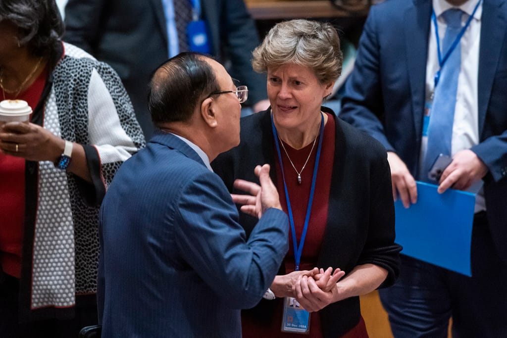 2023 年 10 月,在紐約聯合國總部,中國常駐聯合國代表張軍(左)與英國常駐代表芭芭拉・伍德沃德(Barbara Woodward)在聯合國安全理事會會議前交談。