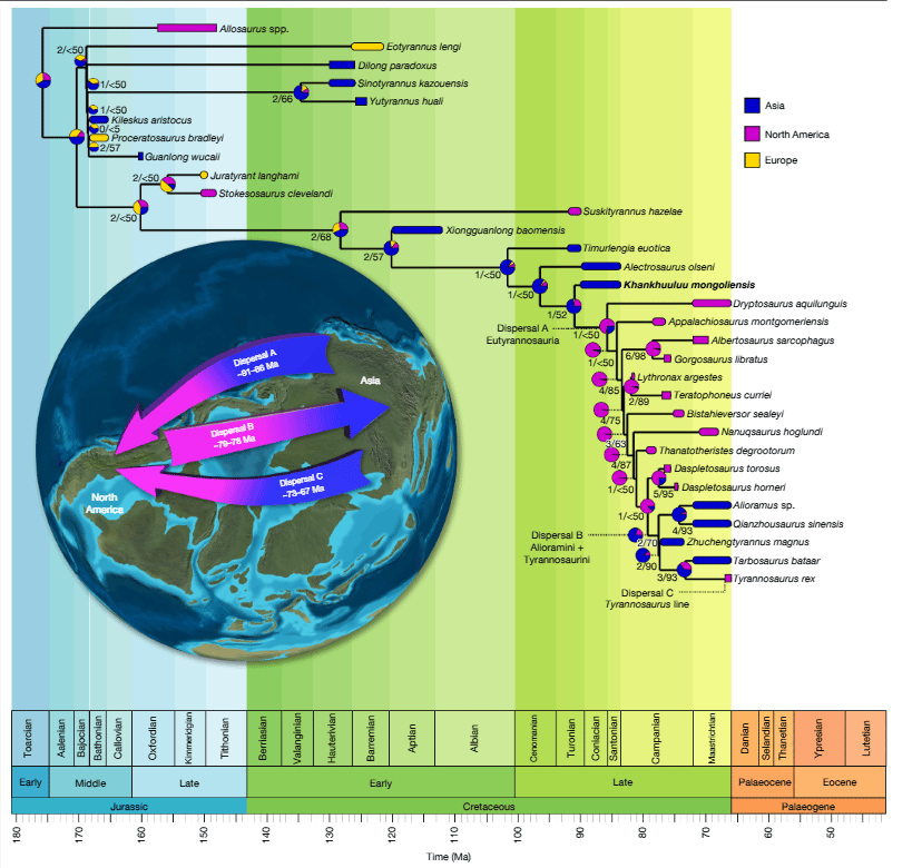 澤倫尼斯基指出,約8,500萬年前,像Khankhuuluu這類早期暴龍親緣物種首度穿越連接西伯利亞與阿拉斯加的陸橋進入北美,並在那裡演化出體型更大、咬合力更強的掠食者。這些恐龍在北美逐漸壯大,成為頂級獵食者。