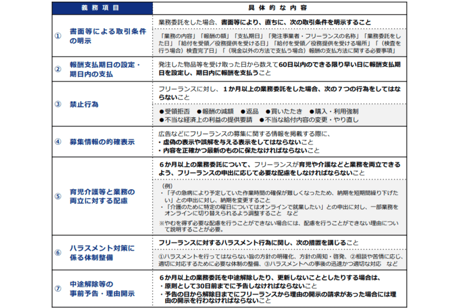 「禁止不當行為」:禁止無故延遲付款、未經同意變更報酬金額、不給報酬就要求修改、單方面取消契約、強迫購買設備或參加活動、限制與其他企業合作。