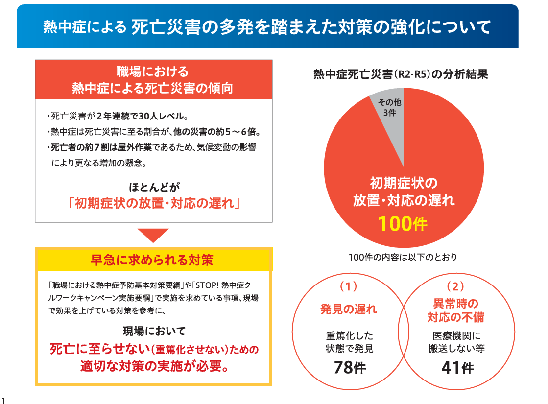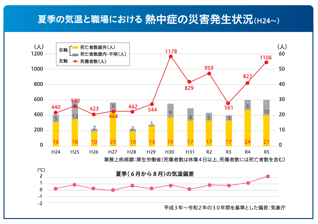根據厚生勞動省統計,2023年因職場中暑導致死亡或需休養4天以上的人數達1106人,比前一年多出逾30%,是有統計以來第二高(僅次於2018年),其中死亡人數為31人,以建築業、警備業等戶外工作者居多。