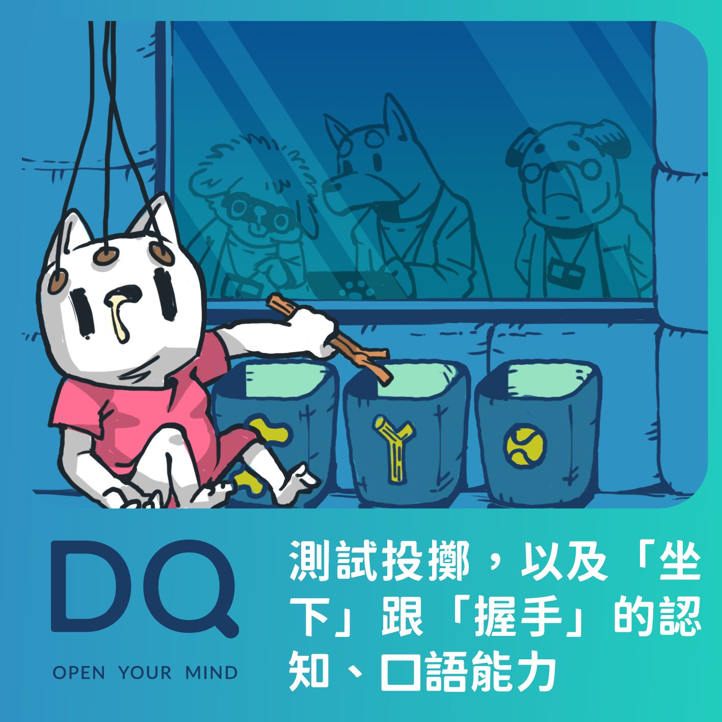 答:測試投擲,以及「坐下」跟「握手」的認知、口語能力