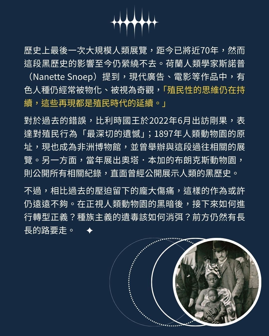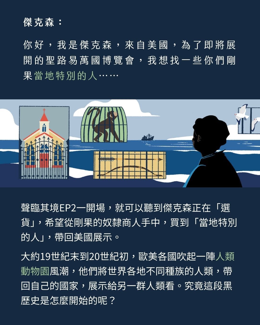 大約19世紀末到20世紀初,歐美各國吹起一陣展示人類的風潮,全球幾乎所有地區,都有人被帶到西方國家展示。EP2〈在美國,他被關進動物園〉中波比的原型人物,就是曾被帶到美國展示的剛果少年奧塔.本加。