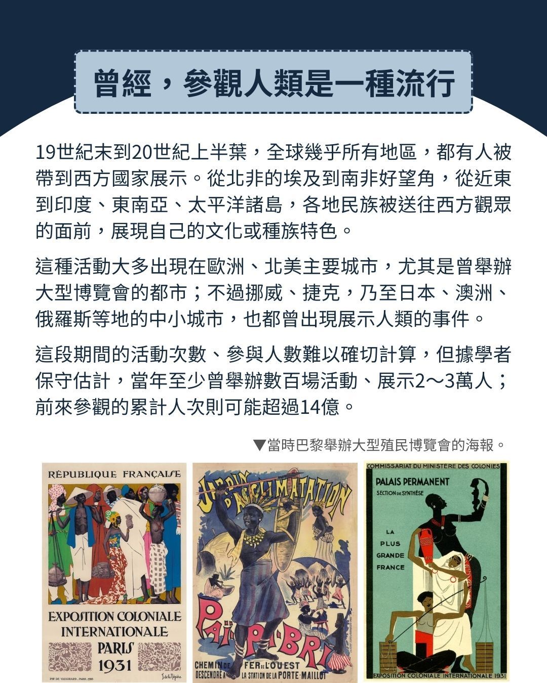 今年,在日本大阪舉辦的世界博覽會,吸引了不少遊客前往參觀。世界博覽會中,各國會向世界展示科技、文化、產業等各個領域的成果,不過你知道嗎?百年前的世博,最常見的展示內容之一,是來自世界各地的人類。