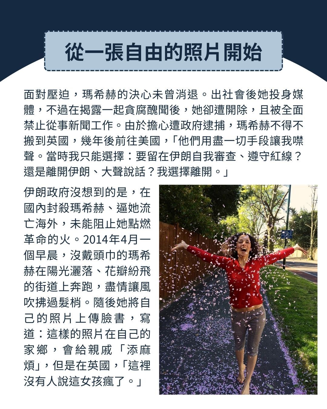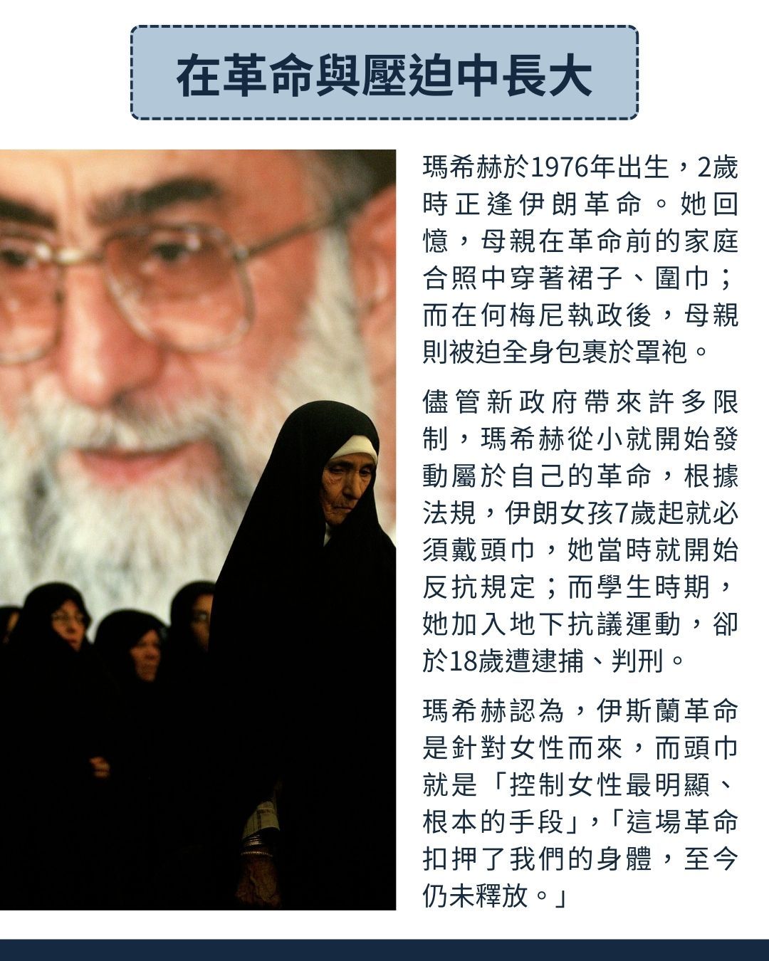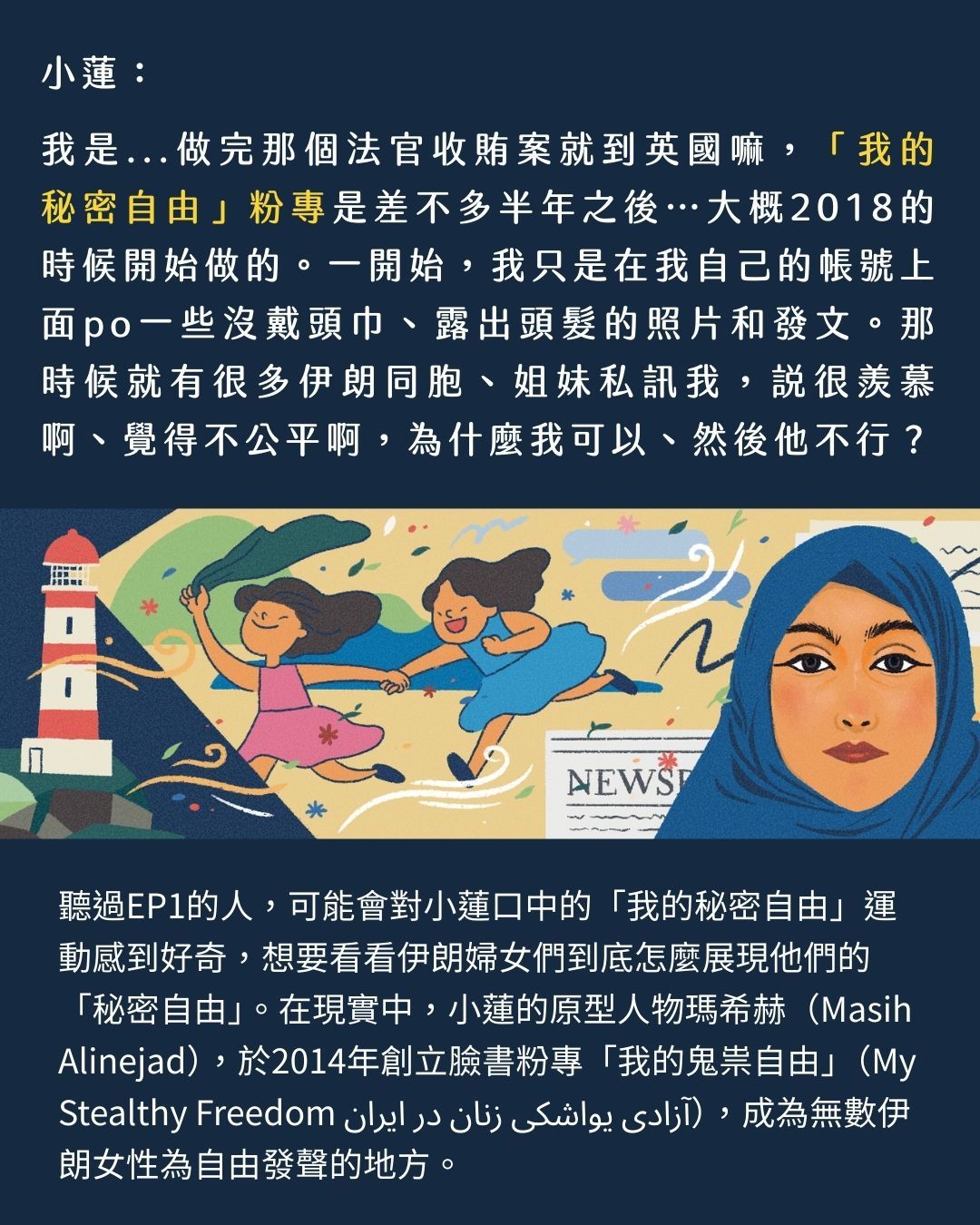 在2022年廣受全球關注的「阿米尼之死」,以及後續席捲伊朗各地的「頭巾革命」之前,許多伊朗女性長期與規定抗爭,希望能揭開頭巾、找回自己的衣著自由。例如〈在伊朗,她被道德警察逮捕〉中,提到的網路運動「我的秘密自由」,在現實中也真有其事。
